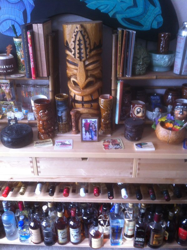 We lingered and talked to Wayne and Beki for a bit, discussing the state of Tiki and their plans for future festival appearances. He talked about his paintings and gave us a cool keepsake, one of Crazy Al’s “Classic Mainland” chess pieces (third from right in photo) designed in the Mai-Tiki style. The Mai Tiki Warrior now holds court as the centerpiece of The Atomic Grog home bar and always will. You’ll see it looming in the background in many cocktail photos I’ve posted (see example).