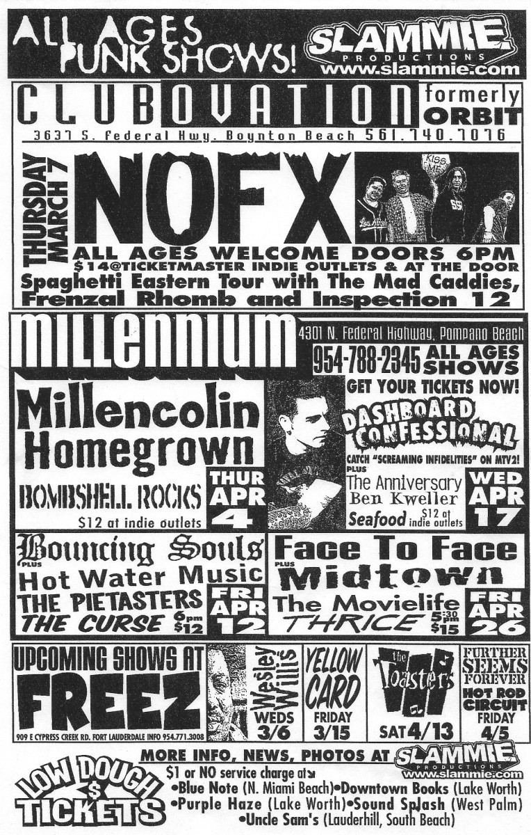 This list contains many, but not all, of the 400 concerts promoted by Slammie Productions from 1992 through 2017. Events ranged from small clubs to theaters, including more than 30 venues in five South Florida counties: Dade, Broward, Palm Beach, Martin and St. Lucie. Follow the links below to historic photos, flyers and posters.
