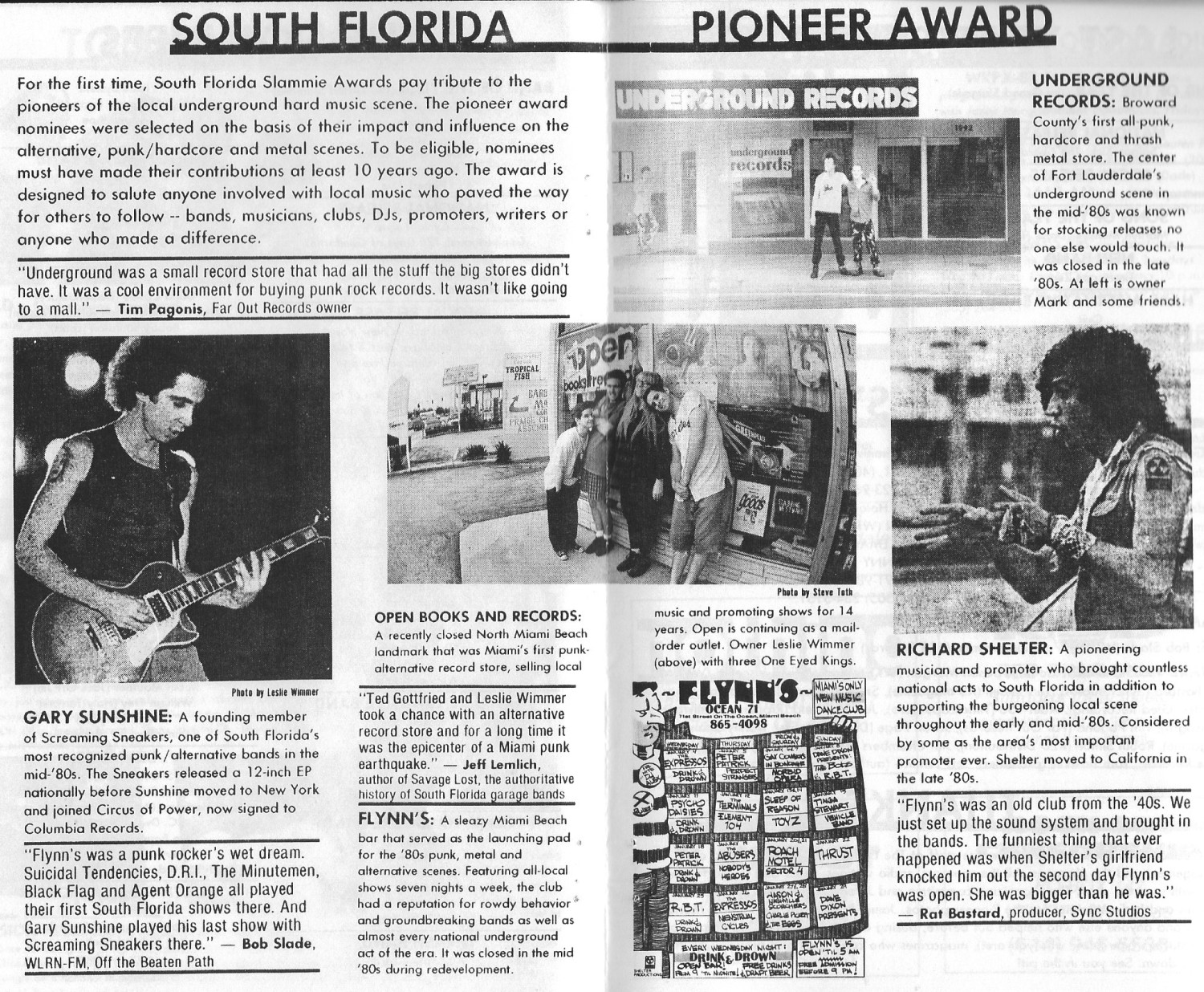 The first South Florida Pioneer Award, honoring scene supporters from at least 10 years ago, went to Open Books and Records, a recently closed North Miami Beach store. The award was presented by Jeff Lemlich, author of Savage Lost, the authoritative history of South Florida garage bands.