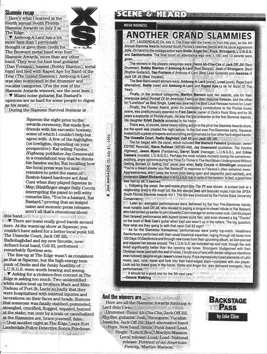 More than 1,100 fans of the South Florida alternative, punk and metal scenes packed The Edge in downtown Fort Lauderdale on July 3, 1995, for the fourth annual South Florida Slammie Awards - a marathon six-hour concert that featured blistering sets from five area bands and one of the best South Florida performances ever by I.R.S./Shock Therapy recording artists Genitorturers.