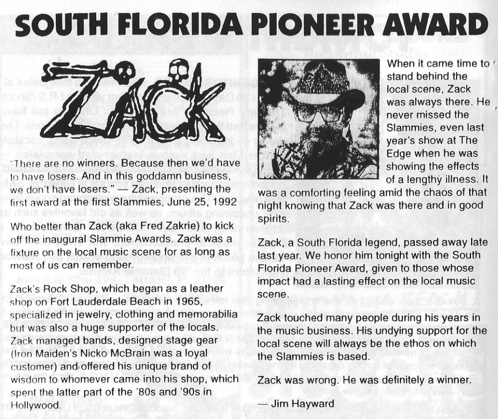 The South Florida Pioneer Award was presented posthumously to Fred Zakrie, a longtime supporter of local music and proprietor of Zack's Rock Shop for more than 30 years. Kristi Zakrie was on hand to accept the award as the Slammies saluted her father, who died late last year.