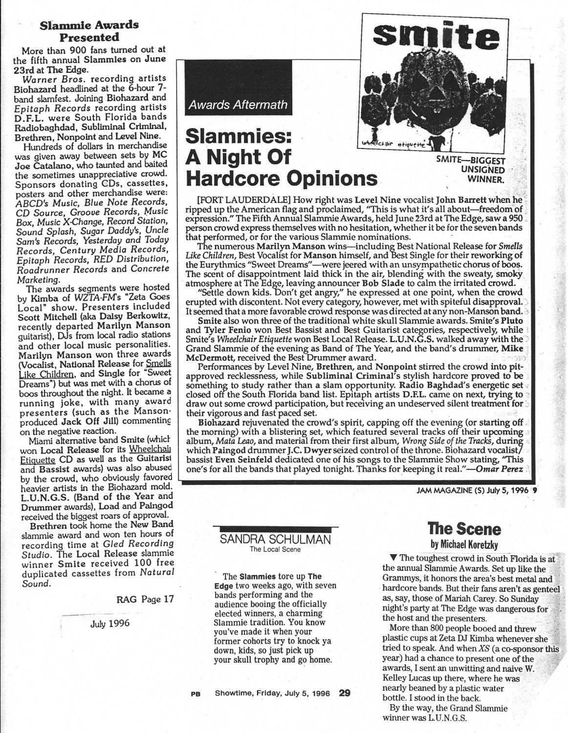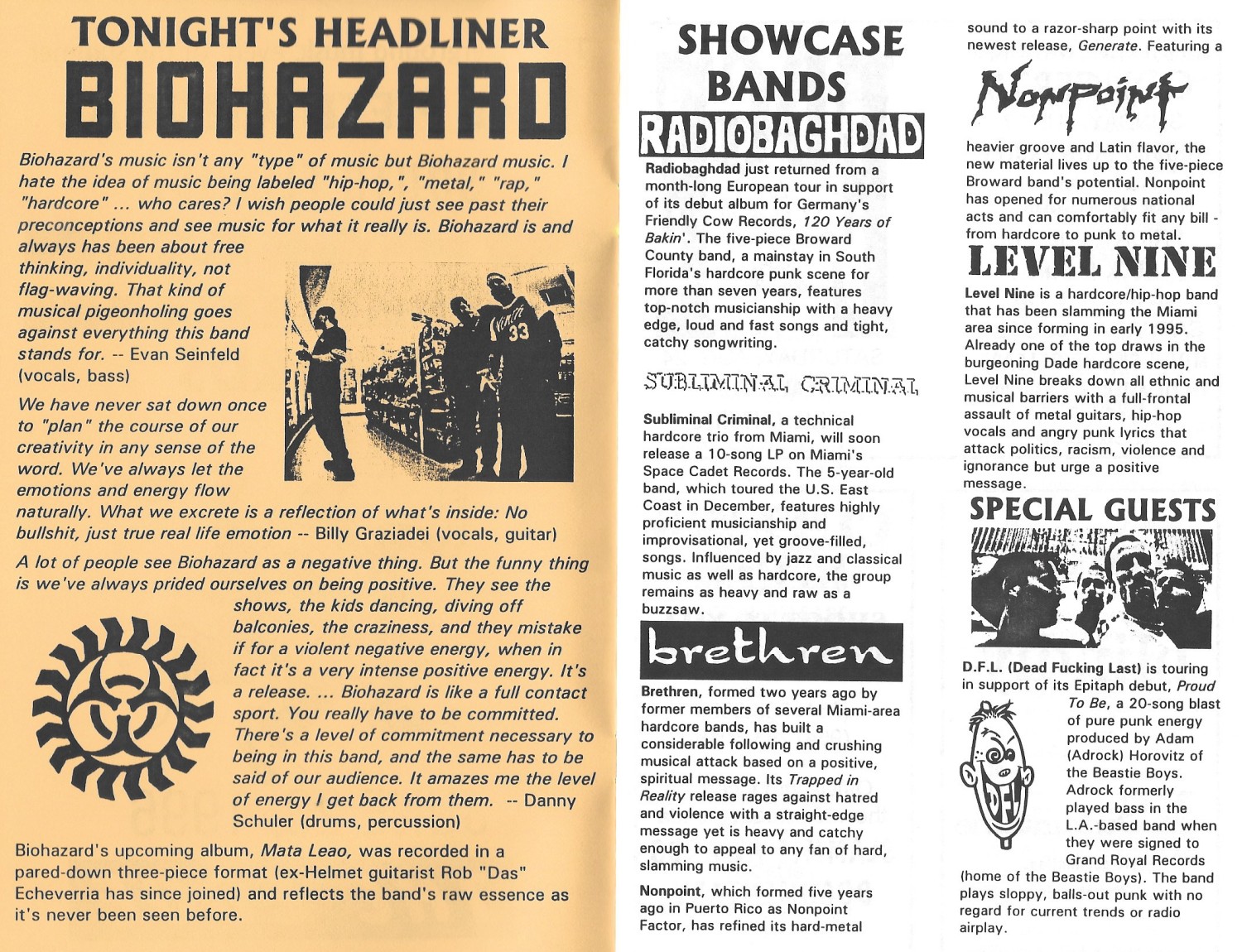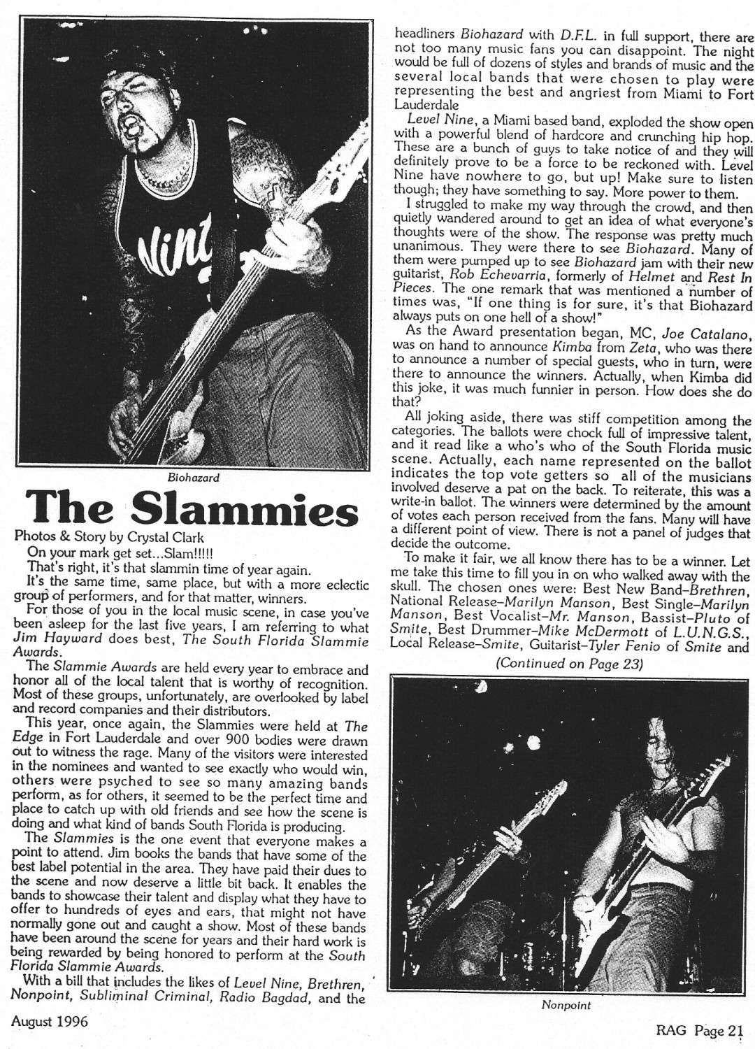 Warner Bros. Records recording artists Biohazard headlined the fifth annual South Florida Slammie Awards on Sunday, June 23, 1996, at The Edge in downtown Fort Lauderdale, performing a flawless set to close the six-hour concert. Joining Biohazard and Epitaph Records recording artists D.F.L. were South Florida bands Radiobaghdad, Subliminal Criminal, Brethren, Nonpoint and Level Nine.