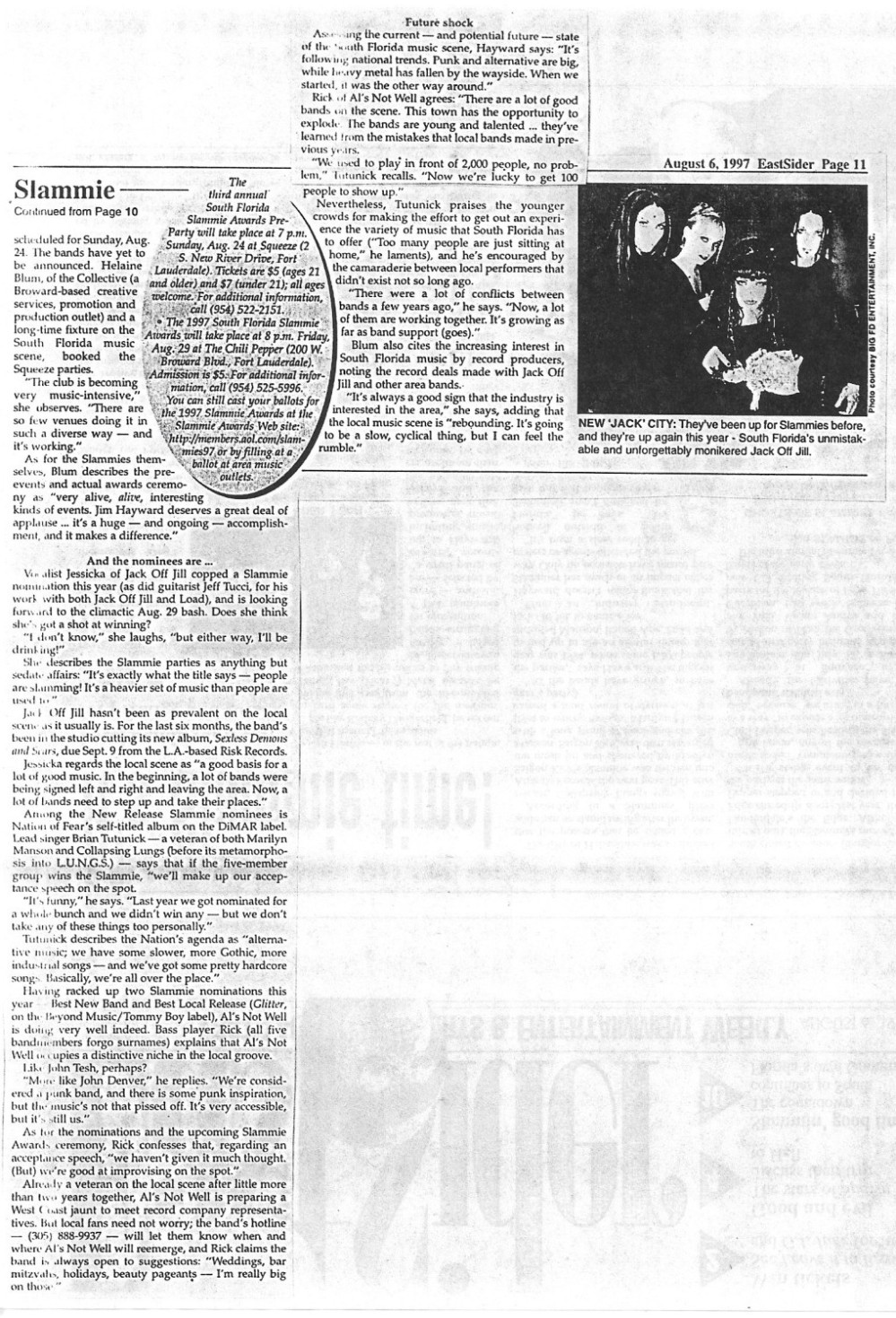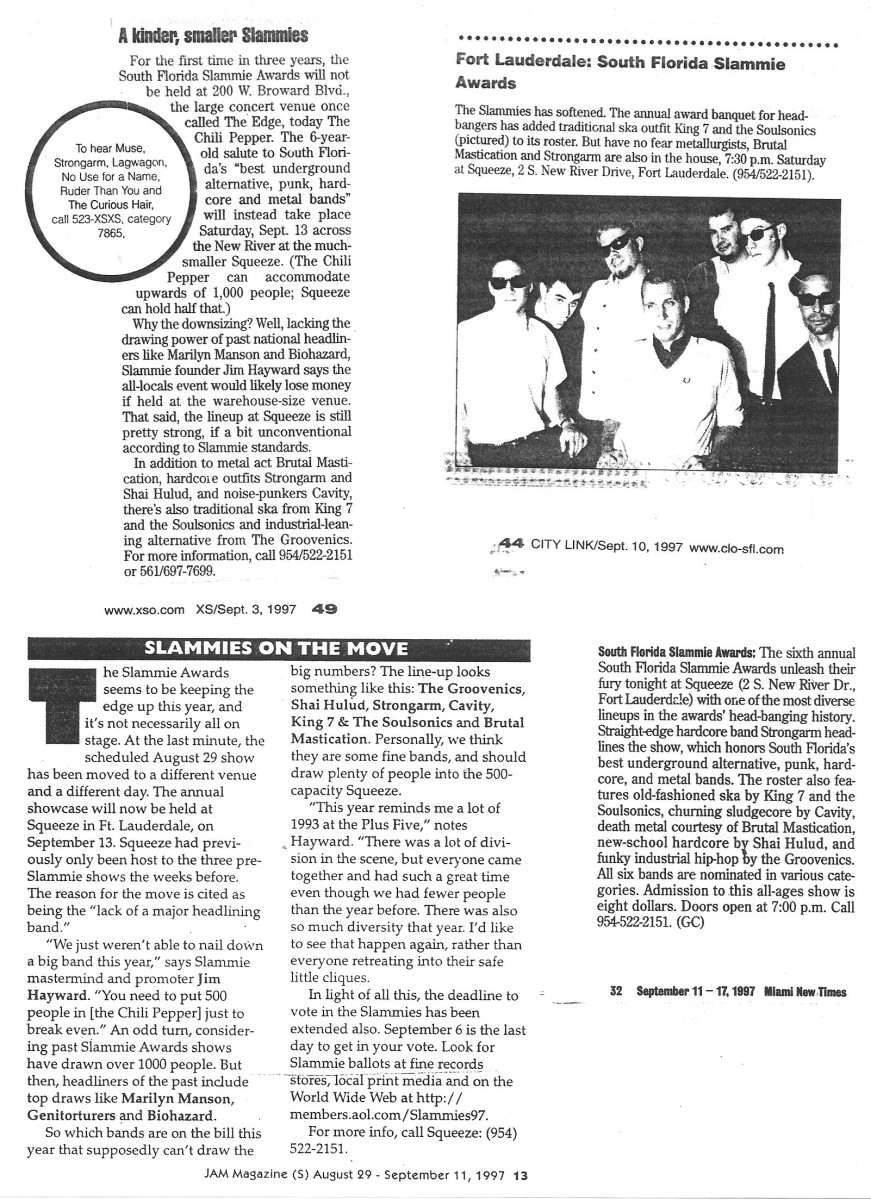 The South Florida Slammie Awards, scaled back for its sixth installment to the cozy Squeeze nightclub in downtown Fort Lauderdale, proved to be an eclectic, marathon 6-hour show for the more than 500 local music fans packed into the venue on Saturday, Sept. 13, 1997.
