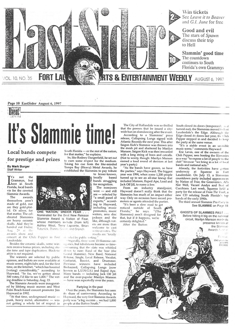 As usual, the Slammies were assisted by many sponsors who donated goods and services to the cause. All the award winners walked away with additional prizes, from studio time to tape duplication to a free tattoo. Concertgoers left with thousands of dollas in prizes, mostly CDs and tapes. The 1997 sponsors were: Blue Note Records, Sound Splash, Uncle Sam's Records, Y&T Records, Music X-Change, Music Box, Universal Music Group, Conquest Music Group, Century Media Records, RED Distribution, Concrete Marketing, Rag magazine, Natural Sound, Beach Sound, Tapeworm Studios, Music Arts Enterprises and Altered State Tattoo.
