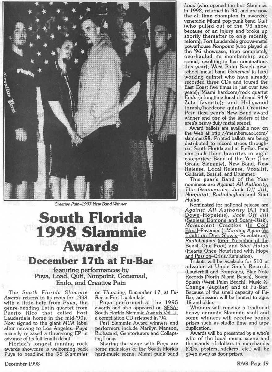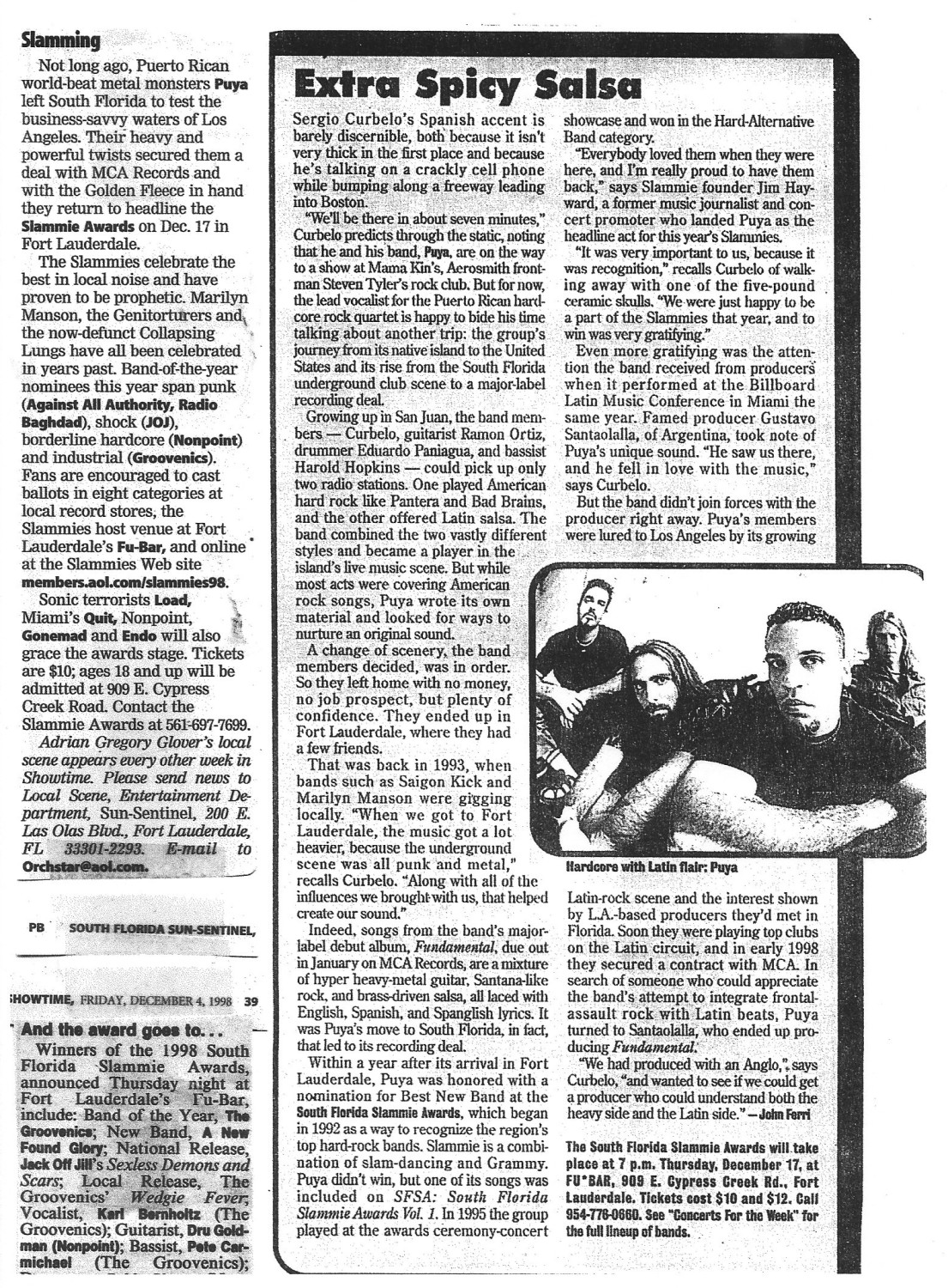 The South Florida Slammie Awards returned to its roots for 1998 with a little help from Puya, the genre-bending Latin quartet from Puerto Rico that called Fort Lauderdale home in the mid-'90s. Puya headlined the '98 Slammies on Thursday, Dec. 17, at Fu-Bar in Fort Lauderdale.