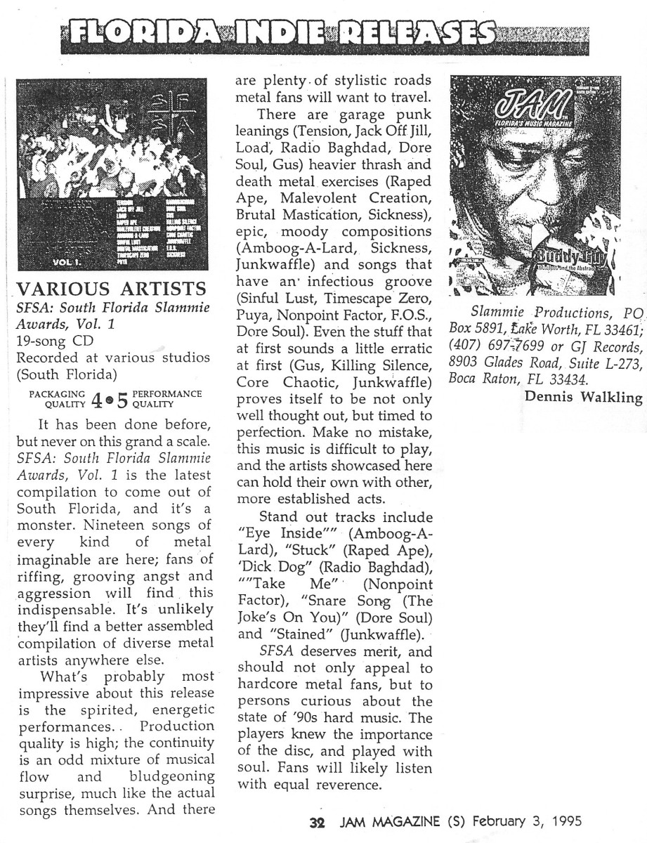 Below are some of the most noteworthy tracks and bands, according to Slammie founder Jim Hayward, who chose and compiled the music on SFSA: South Florida Slammie Awards, Vol. 1. Regrettably, there was never a second volume, but there's enough music on this one disc to satisfy even the most discerning hard-edged music lover. Notes and info updated as of late 2025.
