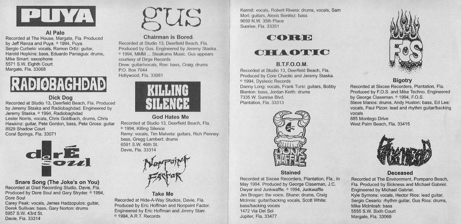 Dick Dog by Radiobaghdad (track 11): Formed in 1988, this influential five-piece punk band from "Fort Lauderhell" featured a core lineup of musicians who went onto play with a who's who of other bands (Collapsing Lungs, Anchorman, Irish Car Bomb, et al.) and impact the scene in numerous ways. But they always came back to Radiobaghdad, known for an endearing no-bullshit approach, tight musicianship and wall of sound that could compete with any hardcore or metal band. Dick Dog - like eight other tracks on SFSA: South Florida Slammie Awards, Vol. 1 - was recorded at Jeremy Staska's venerable Studio 13 in Deerfield Beach. It later appeared on the 120 Years Of Bakin' album (1996). Radiobaghdad released just one more LP (in 1998) but continues to perform on rare occasions, including a 2024 reunion. Drummer Chris Goldbach is a longtime member of Against All Authority.
