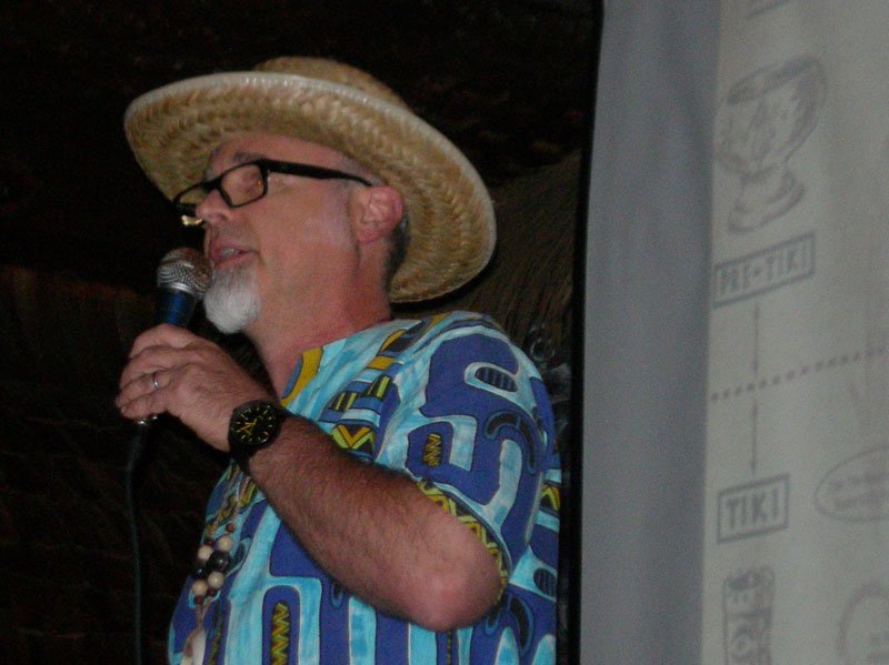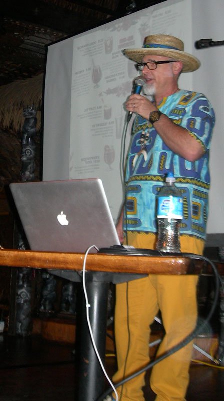 Those lucky enough to score tickets to Jeff “Beachbum” Berry’s sold-out symposium on Thursday afternoon at The Mai-Kai were treated to the author’s most personal presentation to date (see photos below). “Tiki’s Dark Ages: From Fern Bars To Rebirth” delved into much more recent history than many of his past symposiums, covering the period considered the low point in the history of both cocktails and Tiki culture: the 1970s and ’80s. Many in attendance, Berry included, lived through these lean years, making the event even more poignant. The Bum invited attendees to join him in getting into the spirit of things by wearing their polyester finest from that era.