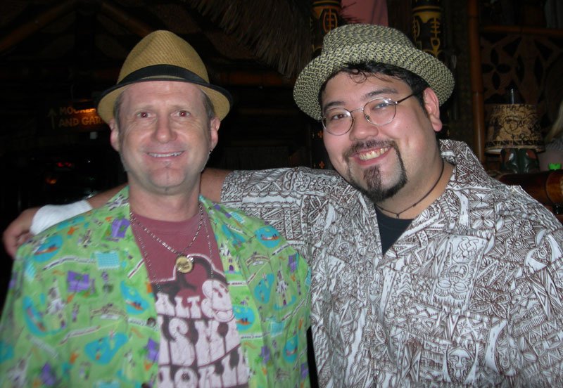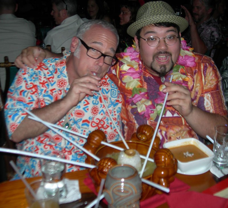 Tiki Kiliki honored Brian and her entire crew of coordinators – including Sherill Gross, Doug Stewart, Stacie (Heelgrinder) Herndon, Patrick LeJeune, Bill Dillard, Joe Garcia and all the volunteers – before the first dinner show. All received a special limited edition of the official mug by Eekum Bookum, and joined Tiki Kiliki on stage for a bow [Photo]. King Kukulele presided over all the main stage shenanigans, doing his usual fine job of keeping the several hundred in the main dining rooms entertained while they enjoyed their exotic food and drinks. Every so often, you heard the gong signaling that another Mystery Drink had been ordered. Among those treated to the ceremonial dance and massive communal bowl were The Sweet Hollywaiians and Mookie, Martin Cate, Beachbum Berry and Steve Yamada (see photo below), and this surprised writer (mahalo John Tremain!).