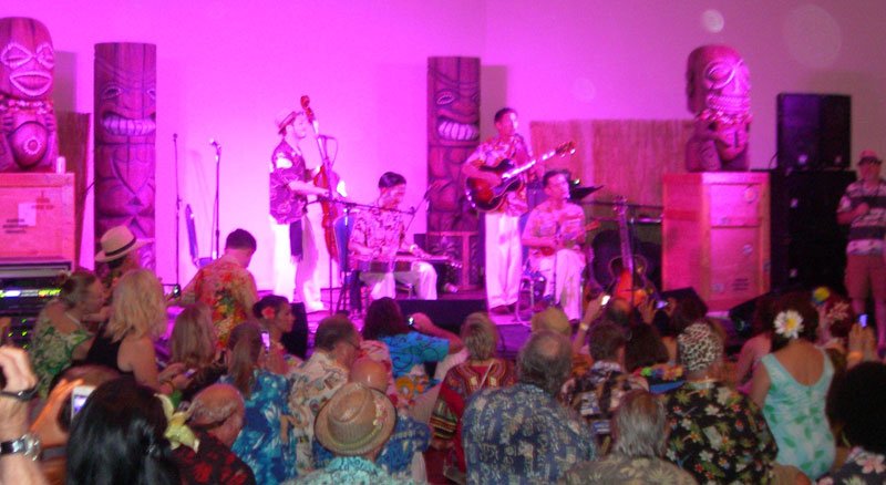 It was back to the Bahia Mar’s giant Commodore Ballroon for the Friday night Main Event, emceed by King Kukulele and featuring live music by The Smokinโ Menehunes from California, Grinder Nova from Atlanta, and headliners The Sweet Hollywaiians from Japan. There were also performances by Medusirena and Angie Pontani, plus most of the vendors kept their booths open all night for shoppers. This spacious 8,200-square-foot ballroom is hands-down the best site for the Main Event that The Hukilau has had to date, offering great sightlines, a large stage, and plenty of room for the merchandise booths, all in one space. The hotel’s one weak spot, its cocktails, was remedied this year. The Hukilau’s sixth main event at the Bahia Mar was arguably its best ever. It’s too bad there will be major changes at the hotel that will likely force a change of venue for next year (see below).