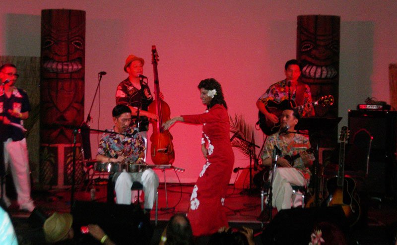 The Sweet Hollywaiians, making their second trip across the pond exclusively to play The Hukilau, were joined by several special guests. Artist Mookie Sato sat in for several numbers, and noted mid-century Polynesian entertainer Nani Maka performed traditional dances during a poignant closing segment. The seemingly ageless Maka was a fixutre at South Florida hotels and nightclubs during the heyday of the exotic supper club, becoming a regular at the Yankee Clipper’s Polynesian Room, Miami’s Polynesian Gardens, The Mai-Kai, and many more. Seeing her perform with The Sweet Hollywaiians was a once-in-a-lifetime opportunity.