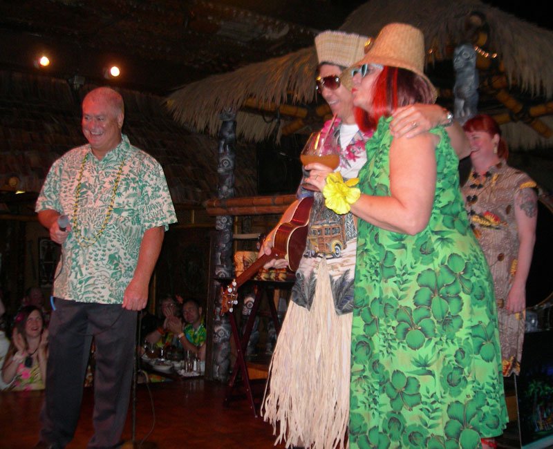Thursday night’s party at the Bahia Mar was punctuated by a solo performance by Pablus of the The Crazed Mugs, a mash-up of Hawaiian music Georgia-style by Kinky Waikiki, and a surprise appearance by Marina and her pod of Aquaticats. Emcee King Kukulele (aka Denny Moynahan) once again served as ringleader of the festivities, just as he has for all previous 12 events. And the night was capped off, as usual, by Tallahassee instrumental surf band The Intoxicators, rocking The Hukilau for the 11th straight year. They were joined by one of the world’s top burlesque performers, Angie Pontani [see video]. But the night was far from over.