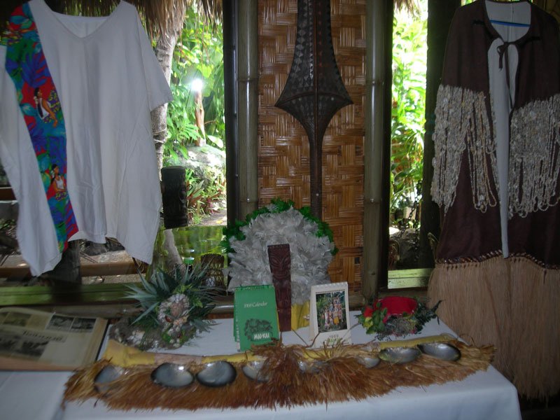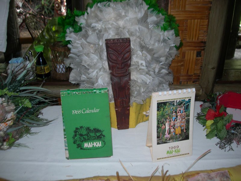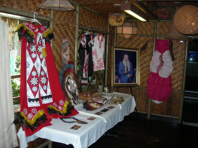 The Tahiti dining room was filled with historic photos, costumes, scrapbooks, mugs, dinnerware, menus and more. Standing watch in the corner was late owner Bob Thornton, shown in a framed photo holding a commemorative silver Rum Barrel mug for the restaurant’s 25th anniversary (the frame normally hangs in the back office). The mug itself was on display nearby for hands-on examination. The old costumes appeared to be in great shape, and it was surprising how heavy the fabrics are. It gives me even more respect for the Polynesian Islander Revue performers, past and present.