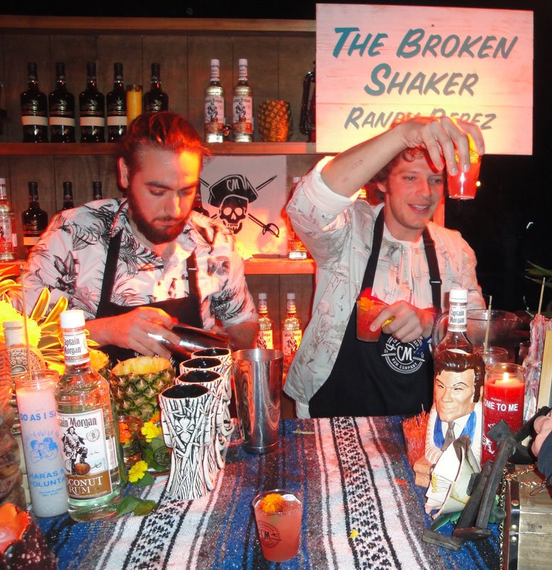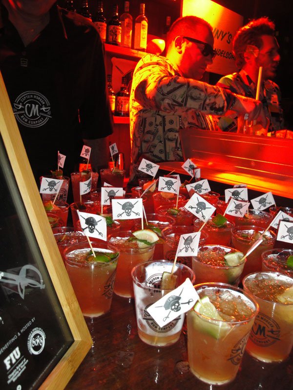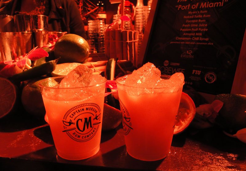 Now, on with the cocktail adventure: We arrived at 10 p.m. from blustery Collins Avenue, through a portal and into a tropical cocktail oasis on South Beach. Booths and drinks are listed in order as we wound our way clockwise around the pool, which was awash with the projected logo of sponsor Captain Morgan rum.