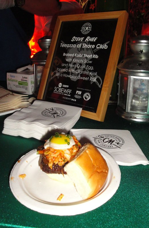 Of those I tried, I was impressed by all the chefs. I savored the rich salt-baked American red snapper from Eric Grutka of Ian’s Tropical Grill in Stuart. The one-bite servings were doled out in spoons, the perfect way to nosh when you’re also juggling cocktails. The pork tacos from Scott Linquist of Miami’s Coyo Taco were delicious, though the corn tortilla was a bit difficult to handle with one hand. But the bite of the night was the decadent sliders from Steve Rhee, chef at the Shore Club’s Terrazza restaurant. [See photo] A Hawaiian sweet roll was filled with braised kalbi short rib with kimchi slaw and a fried quail egg, topped with cilantro aioli. This is an instant Tiki bar classic.
