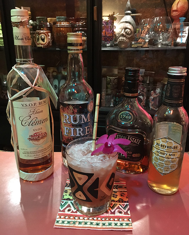 Launched at Tiki Kon 2014, Iron Tikitender is produced by Blair Reynolds, creator of BG Reynolds Syrups. The event returned to Tiki Kon last year after a two-year absence. Grant emerged victorious after doing battle with fellow finalists Kelly Merrell (Trader Sam’s Enchanted Tiki Bar) and Mark Hooper (Arkansas-based bartender and Tiki ninja). Hosted by Reynolds with commentary by Ray Wyland (Tiki With Ray) and Jason T. Smith (Tiki treasure hunter), the contest was a spectacle that drew hundreds of Tiki cocktail fans to the main ballroom of the Red Lion Hotel.