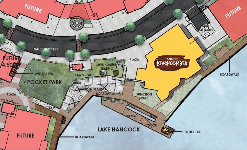 The renderings “showcase an open and welcoming environment, highlighting the shoreline of Lake Hancock, furthering the tiki ambiance of Don the Beachcomber,” according to the story posted March 19. The plans are still in the early stages of permitting, it notes. The images from the article are shared below.