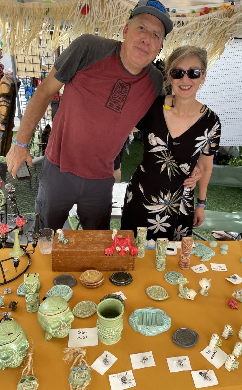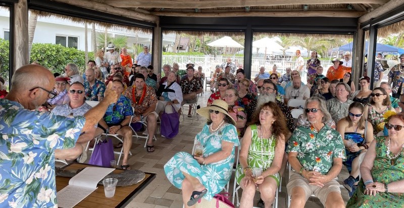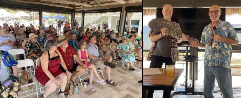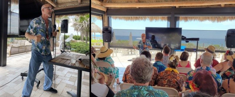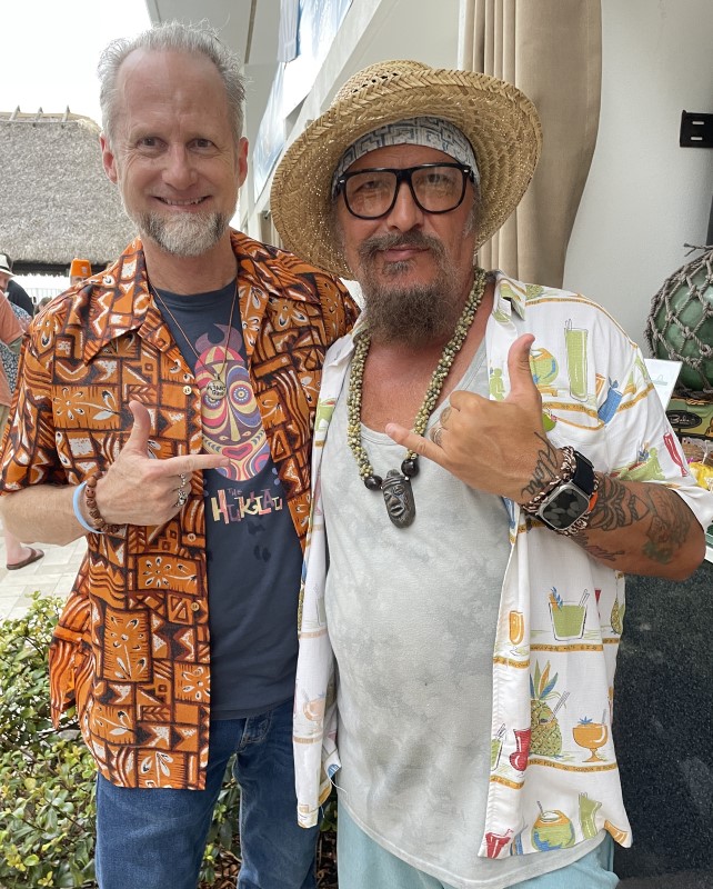 In 2022, The Hukilau organizer Richard Oneslager (also a major investor in The Mai-Kai ownership group) joined Fuller for a presentation at the Beachcomber in which the new owner presented his ambitious plans. Gelardi and longtime manager Kern Mattei also spoke, and later we enjoyed a South Seas show on the beach featuring Mai-Kai performers. Last year, creative director “Typhoon Tommy” Allsmiller brought villagers up to speed on his restoration work with an exclusive presentation, while Mattei returned with poolside Mai-Kai cocktails and merchadise in the Tiki Treasures Bazaar.