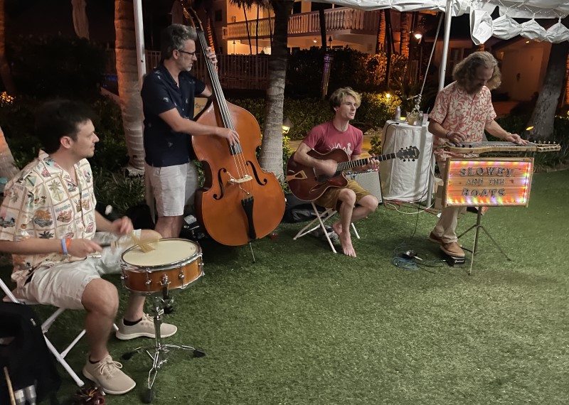 The music of Slowey and the Boats set the tone for The Hukilau 2024, familiar yet exotic and always pairing well with the delicious cocktails and tropical surroundings. The band made multiple appearances, from the main stage to the bungalow courtyard, performing songs from their three albums on Hi-Tide Recordings. A new LP, Slowey Goes West, is due out July 28.