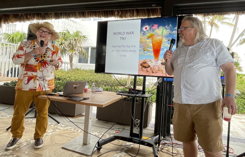 At the top of my list is anything where Jeff “Beachbum” Berry and David Wondrich collaborate. I missed Friday’s Wind From the East: Tiki’s East Asian Mixologists, but I was able to grab a front-row seat for World War Tiki: Fighting the Big One on One Hundred Million Drinks a Day at 5 p.m. Saturday. It was the only presentation under the large North Tiki Hut that’s typically reserved for the Beachcomber’s oceanfront Deep Restaurant.
