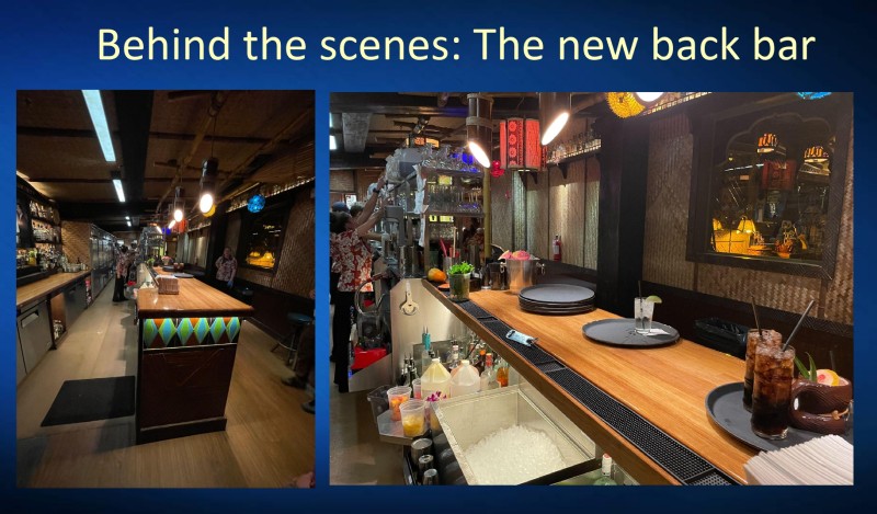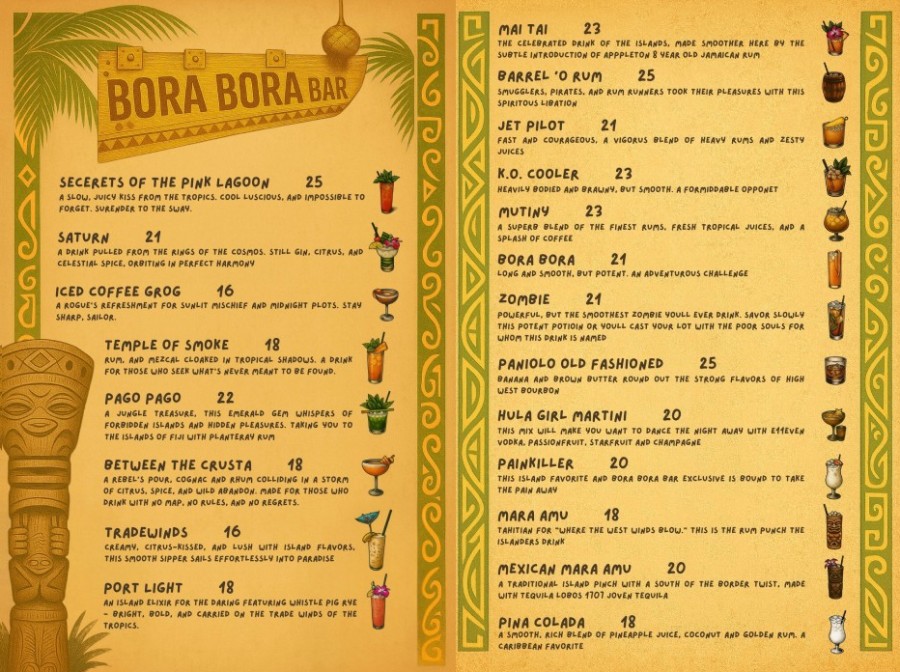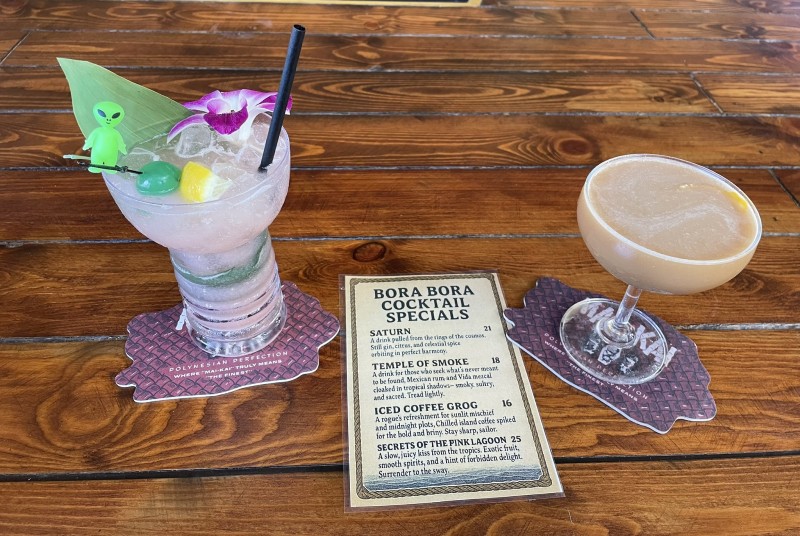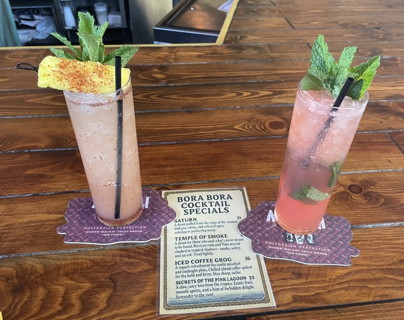 Remember, you can still order any of the other cocktails from the main menu, which is always offered at the Bora Bora Bar. The new menu, displayed in two-sided stands across the bar, also touts eight beers and six wines by the glass. A new menu is in the works, Starr said, hopefully to be introduced in March to coincide with a new early Sunday performance of the Polynesian Islander Revue on the indoor stage.