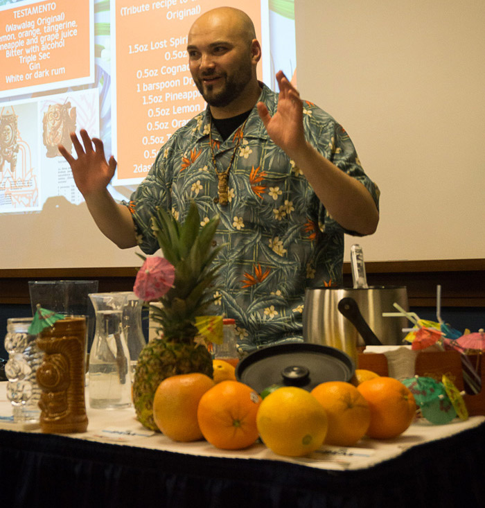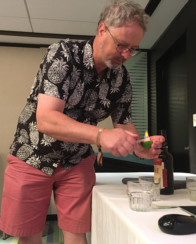 Matt Pietrek demonstrates a flaming garnish during his Okole Maluna Cocktail Academy class at The Hukilau 2019. (Photo by Hurricane Hayward)