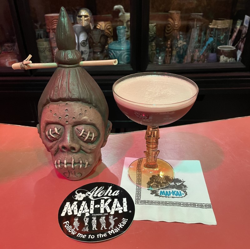 The Black Magic Cocktail at The Atomic Grog, October 2023. The Mai-Kai Shrunken Head mug by Tiki Tony and Eekum Bookum for The Hukilau 2017. (Photo by Hurricane Hayward)