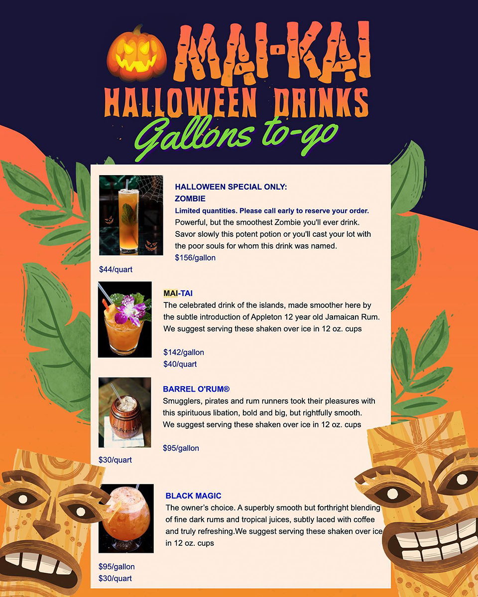 The Zombie, which traces its roots all the way back to tropical drink pioneer Don the Beachcomber, is available for a limited time as part of The Mai-Kai’s periodic takeout cocktail program. You can order the deadly classic by the quart and gallon, the perfect addition to weekend Halloween gatherings.