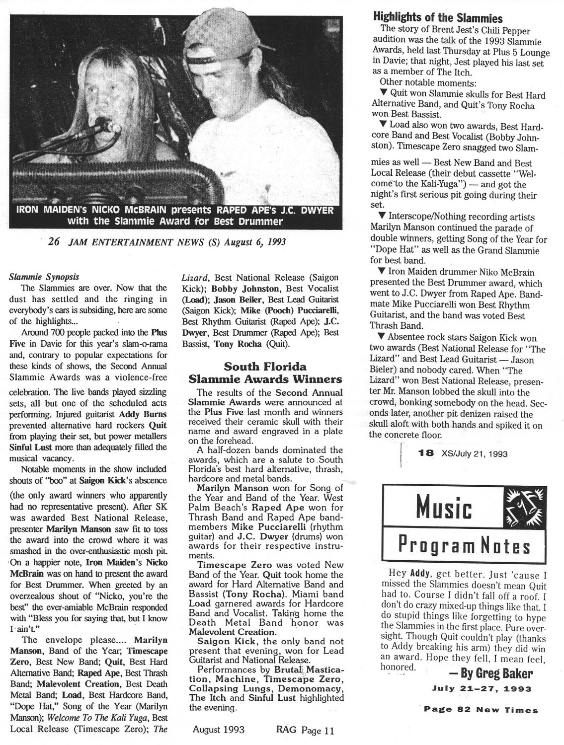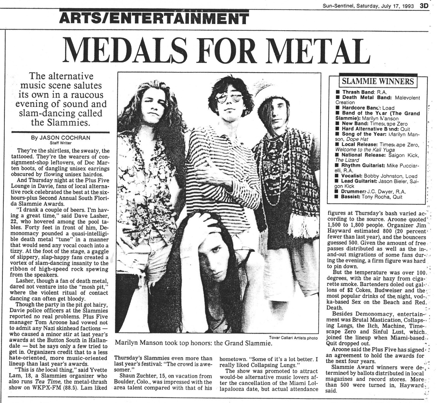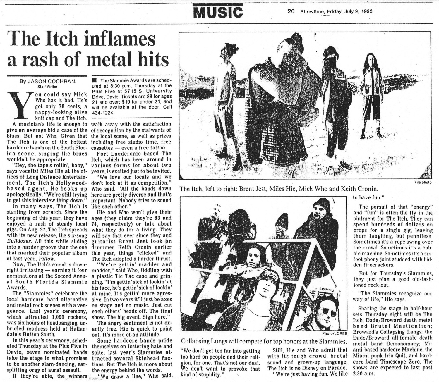 Nearly 700 people from the South Florida hard music scenes came together on July 15, 1993, for a violence-free celebration of the area's best bands and musicians: the second annual South Florida Slammie Awards at the Plus Five in Davie.