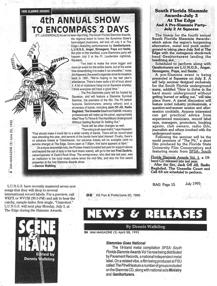 More than 1,100 fans of the South Florida alternative, punk and metal scenes packed The Edge in downtown Fort Lauderdale on July 3, 1995, for the fourth annual South Florida Slammie Awards - a marathon six-hour concert that featured blistering sets from five area bands and one of the best South Florida performances ever by I.R.S./Shock Therapy recording artists Genitorturers.