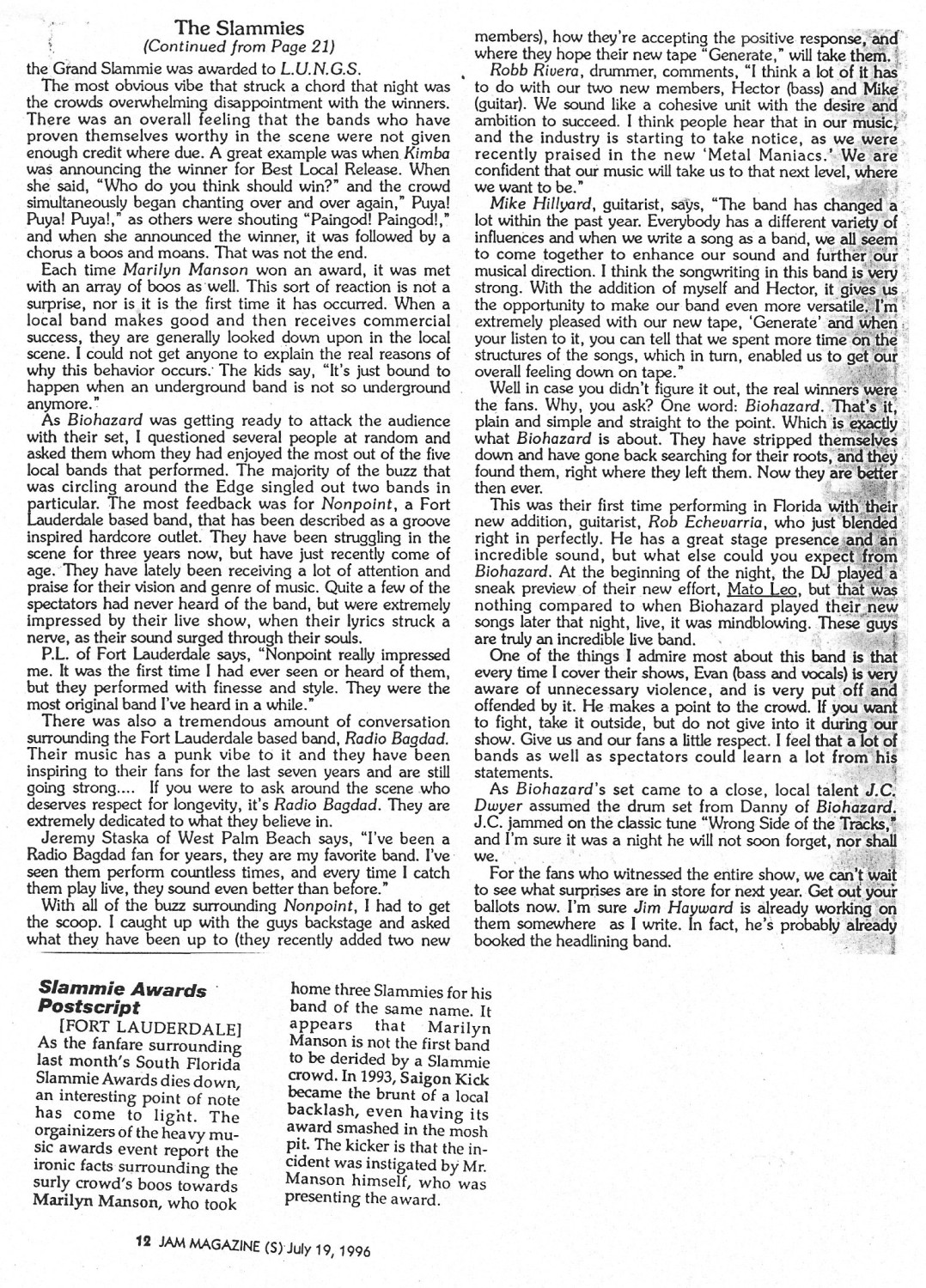Warner Bros. Records recording artists Biohazard headlined the fifth annual South Florida Slammie Awards on Sunday, June 23, 1996, at The Edge in downtown Fort Lauderdale, performing a flawless set to close the six-hour concert. Joining Biohazard and Epitaph Records recording artists D.F.L. were South Florida bands Radiobaghdad, Subliminal Criminal, Brethren, Nonpoint and Level Nine.