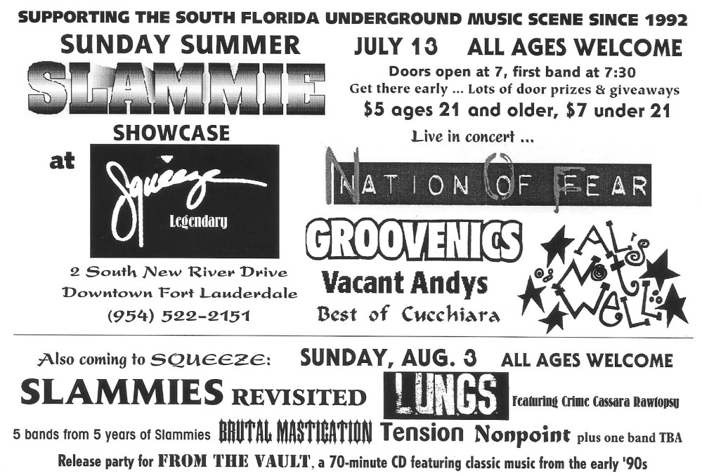The South Florida Slammie Awards, scaled back for its sixth installment to the cozy Squeeze nightclub in downtown Fort Lauderdale, proved to be an eclectic, marathon 6-hour show for the more than 500 local music fans packed into the venue on Saturday, Sept. 13, 1997.