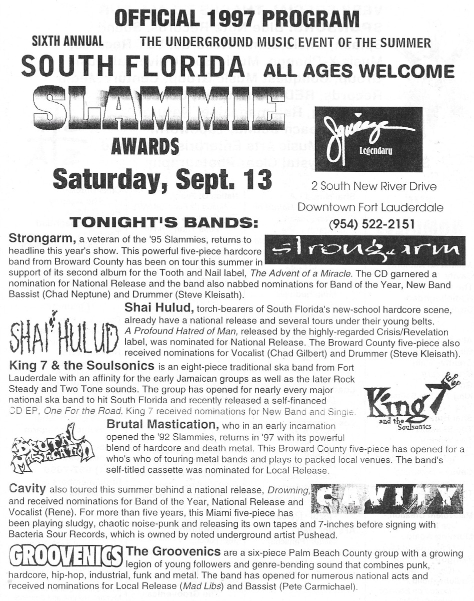 The Groovenics (winners of the Local Release and Bassist awards) kicked off the festivities around 7:30 and immediatly got the crowd moving. In true Slammie tradition, the intensity level never let up until well past 1 a.m. when the show finally ended with a rousing set by Tooth and Nail recording artists Strongarm (featuring award-winning drummer Steve Kleisath). In between, the crowd was treated to a teeth-rattling set by Miami sludge-core masters Cavity, an uplifting hardcore set from Broward County's Shai Hulud (also featuring Kleisath) and a Slammie first, a graceful set of traditional ska by King 7 & The Soulsonics.