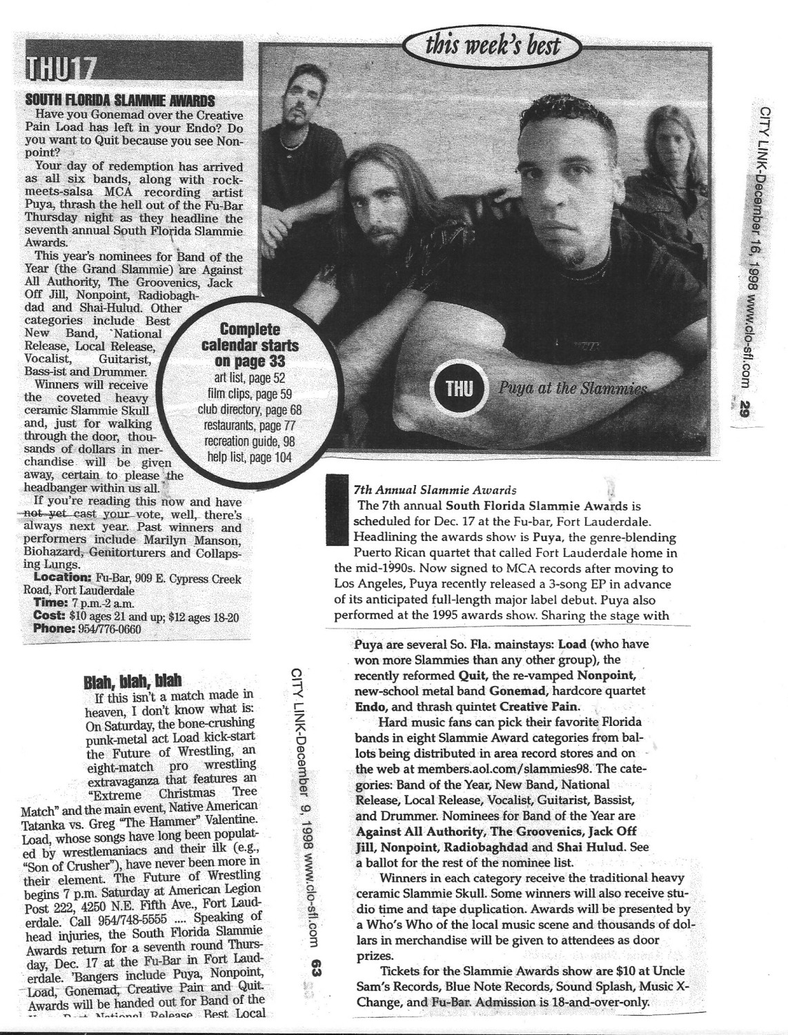 The South Florida Slammie Awards returned to its roots for 1998 with a little help from Puya, the genre-bending Latin quartet from Puerto Rico that called Fort Lauderdale home in the mid-'90s. Puya headlined the '98 Slammies on Thursday, Dec. 17, at Fu-Bar in Fort Lauderdale.