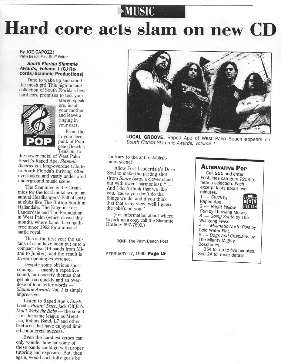 Stuck by Raped Ape (track 4): Established in 1988, this "techno-groove-death-thrash" metal band was best known for its crushing live shows and acclaimed 1993 EP, Terminal Reality. This is one of the songs that propelled the Palm Beach County foursome into new territory with a groove-laden, multi-vocal attack. This version of Stuck, taken from the band's 1994 demo, later appeared on the 2013 retrospective, Land Of Broken Promises (Divebomb Records). Raped Ape changed its name to Paingod and released a self-titled debut album in 1997 (featuring a new recording of Stuck) before calling it a day. One of the band's guitarists, J.P. Soars, put his metal days behind him and went on to solo success as a blues artist, releasing seven albums and touring non-stop since 2008.